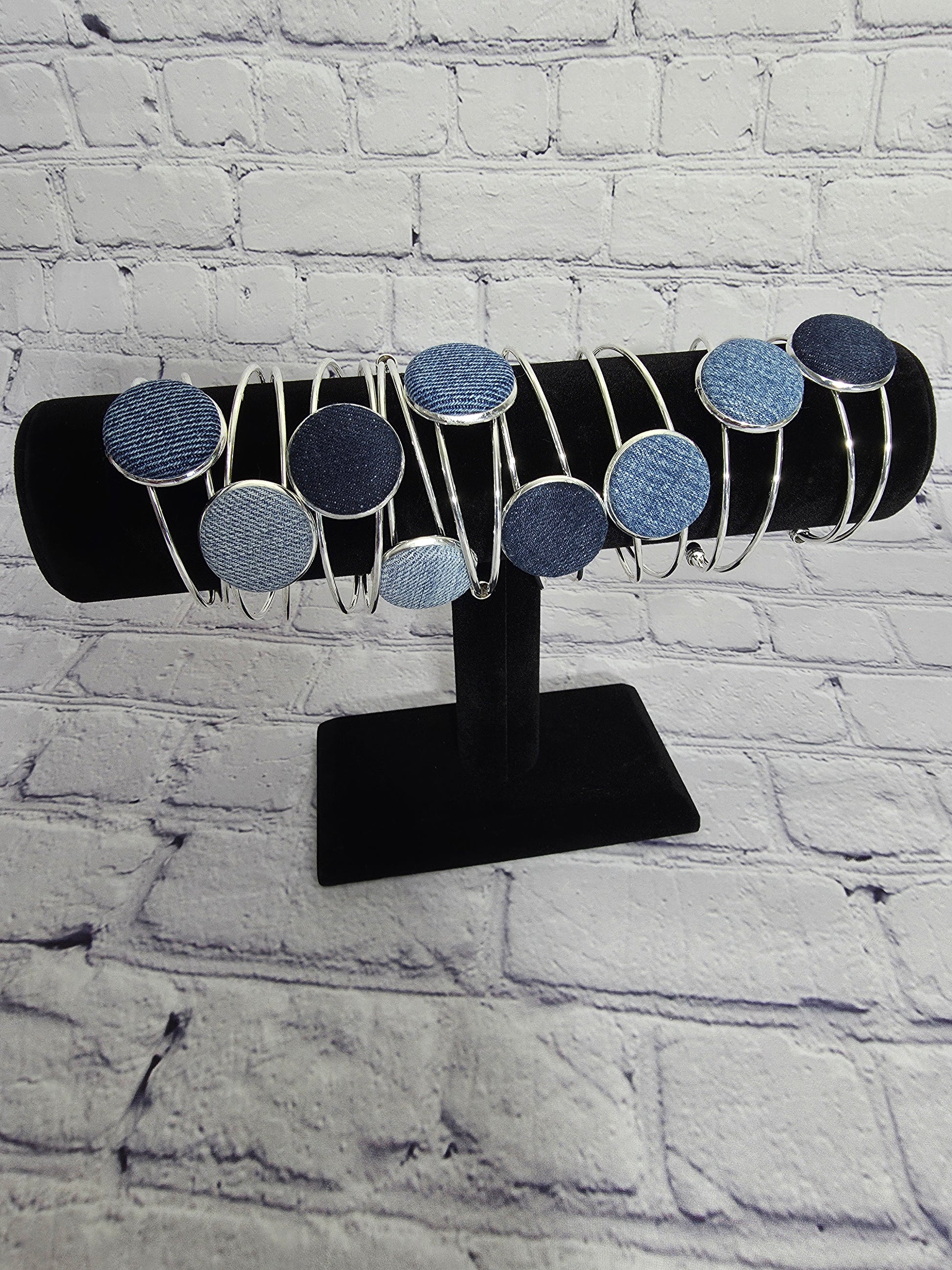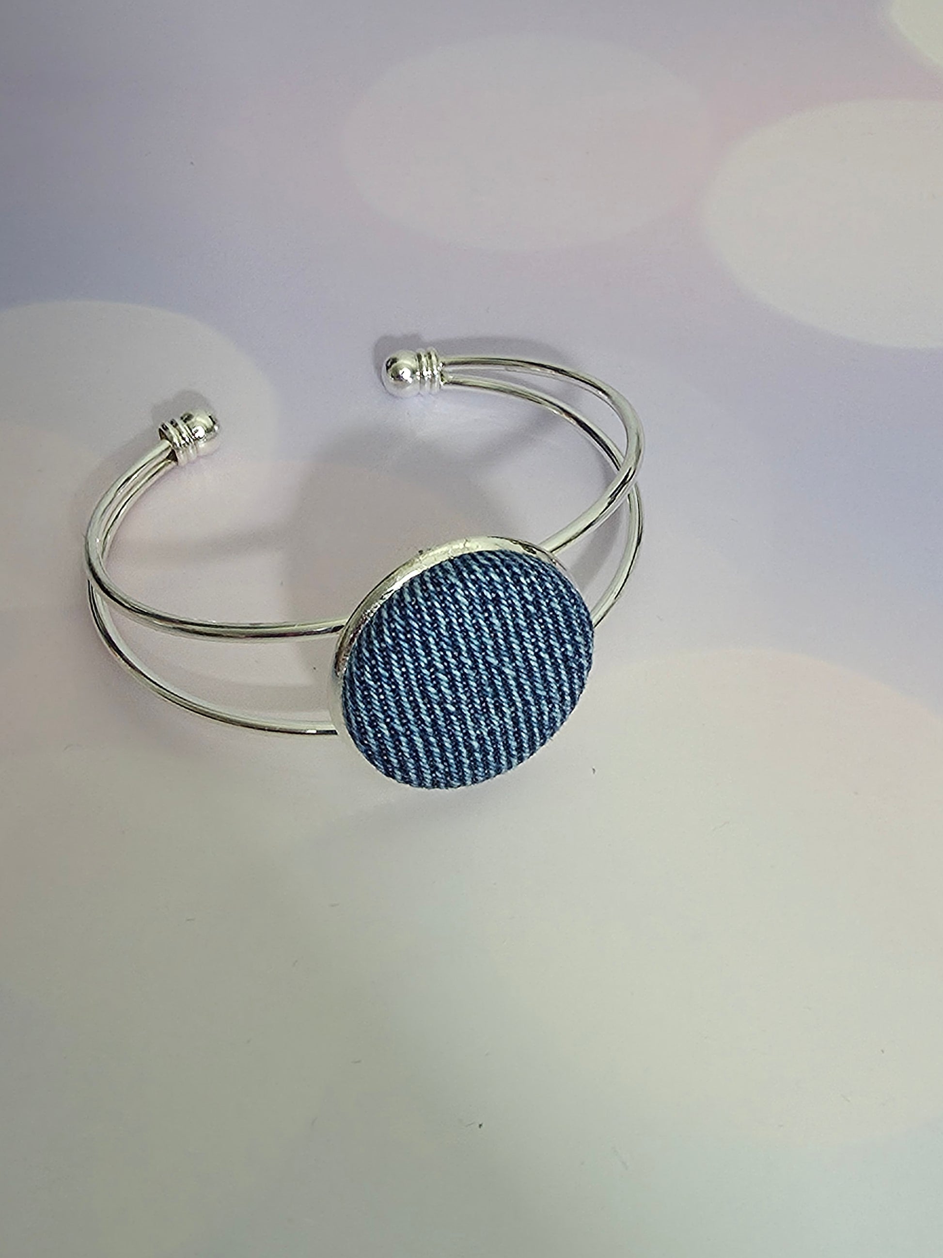 Embrace casual elegance with this striking Denim Chic Cuff Bracelet. A perfect blend of everyday style and sophisticated design, this adjustable cuff features a bold circular centerpiece showcasing authentic denim fabric.