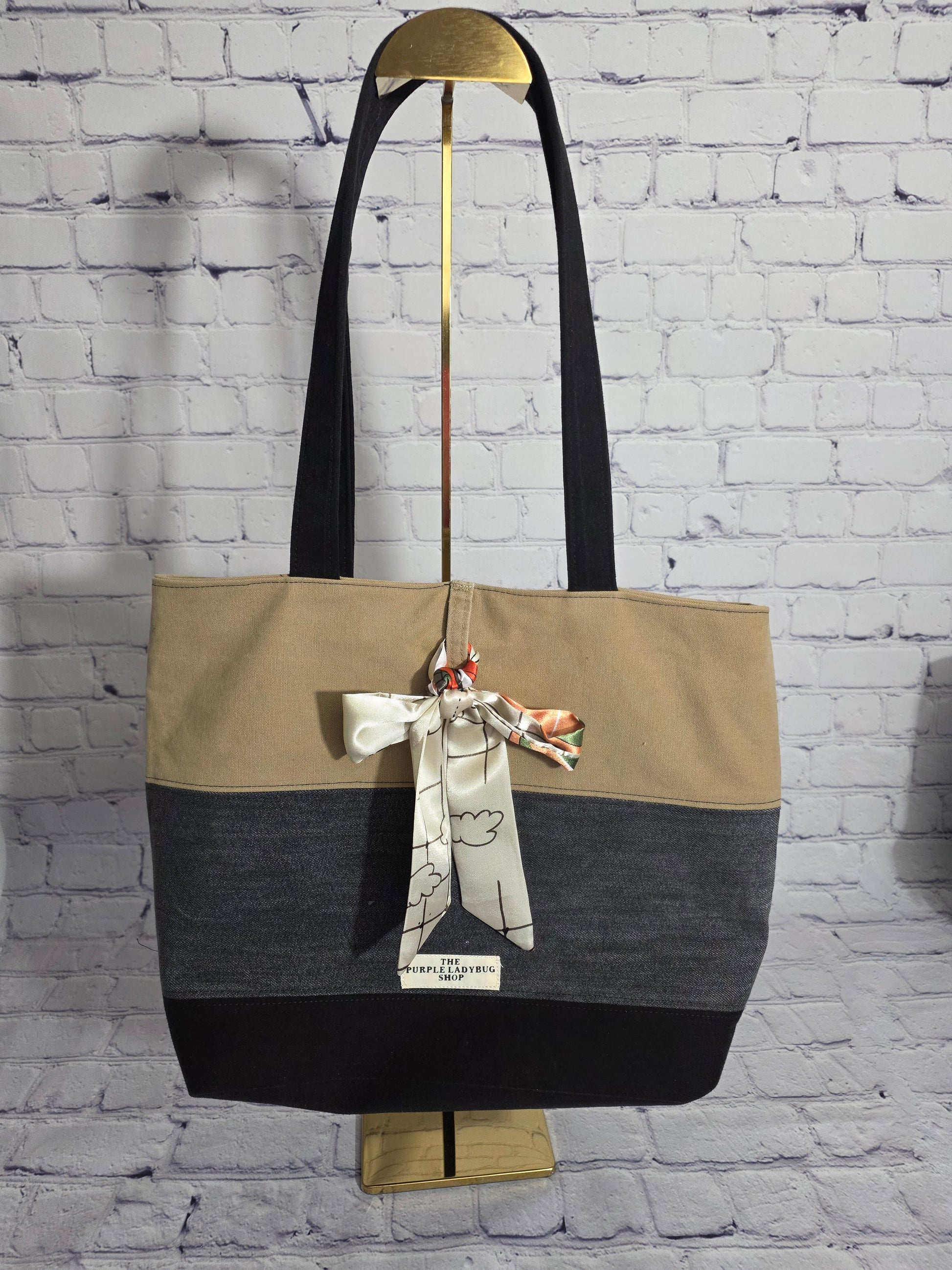 Distinctive Tri-Color Design: The body features a sophisticated blocked design in three complementary colors: a natural khaki/tan at the top, a textural charcoal gray/denim in the middle, and a solid black base for a grounded, stylish look.